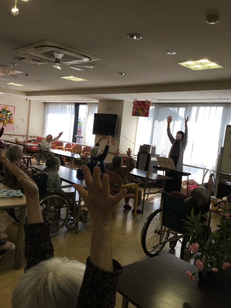 一般のレクリェーション活動に加えて、音楽活動では、専門の音楽療法士の指導のもと、音楽活動を楽しんでいただいており、大変好評を得ています。
